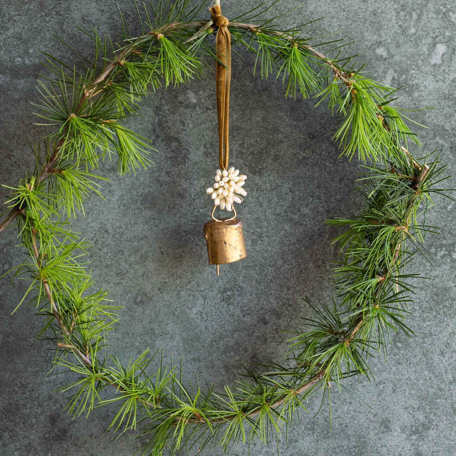 Handgemaakt ornament met messing bel, witte parelkralen en fluwelen lint – een stijlvolle mix van vintage charme en feestelijke elegantie.
