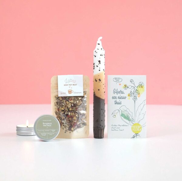 Hoera, een nieuw huis! 🎉 Verstuur dit brievenbus cadeau Nieuw Huis rechtstreeks naar het nieuwe adres om de kersverse bewoners meteen een warm welkom te geven. Een cadeaubox met gulden sleutelbloem bloemenzaden – symbolisch voor de sleutel tot een plek vol warmte, groei en nieuwe herinneringen. Een cappuccino confetti kaars voor wat sfeer in huis, de kruidige ‘Kom tot rust’ thee met gember en kardemom om even bij te komen van de verhuizing, en een soja geurkaars om hun nieuwe thuis meteen heerlijk te laten ruiken 🏡