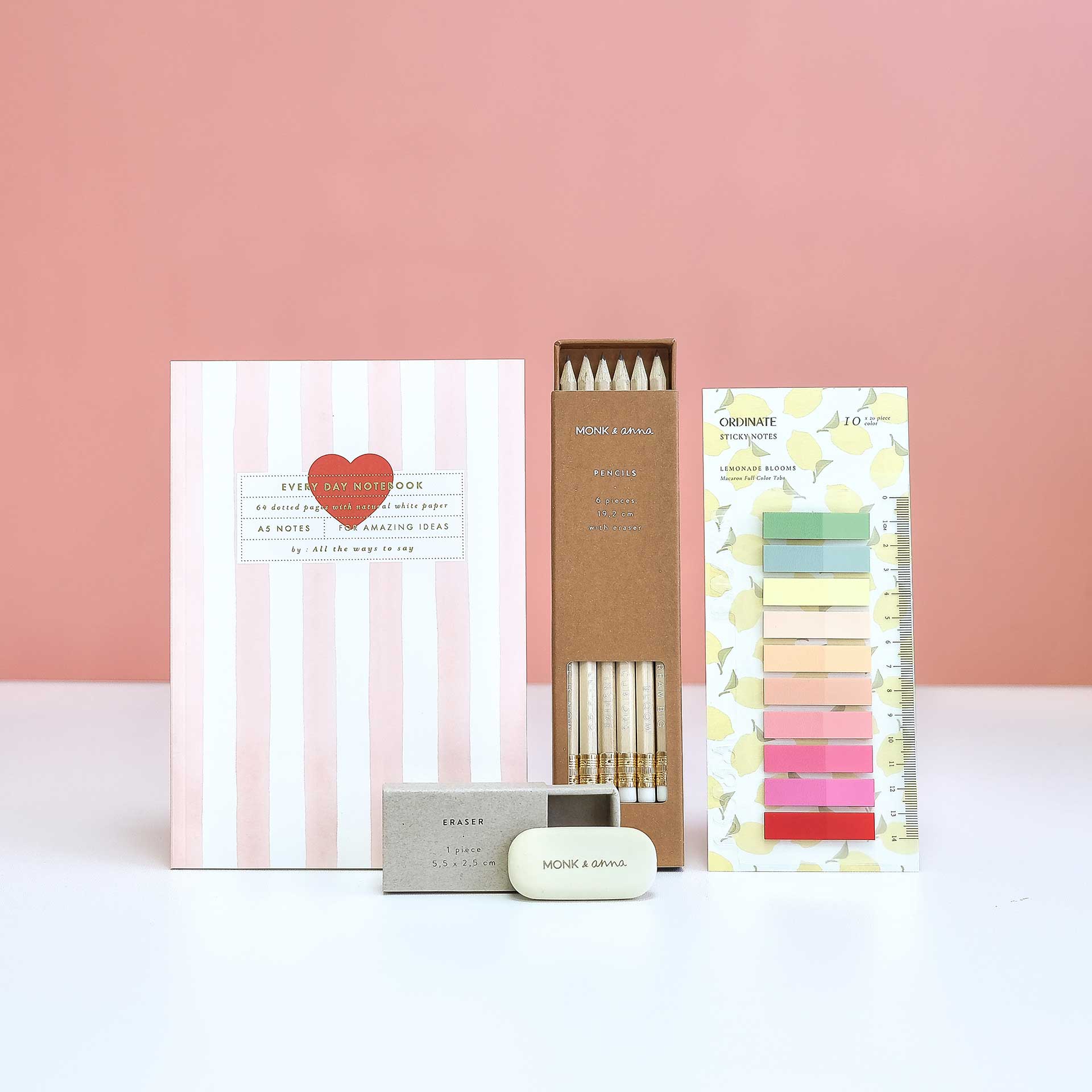 Een set van 6 houten potloden met gum, stijlvol verpakt in een gekleurd doosje van het merk Monk & Anna. Elk potlood bevat een inspirerende quote; dream big / bloom / stay curious / inspire / let’s go / time is now.