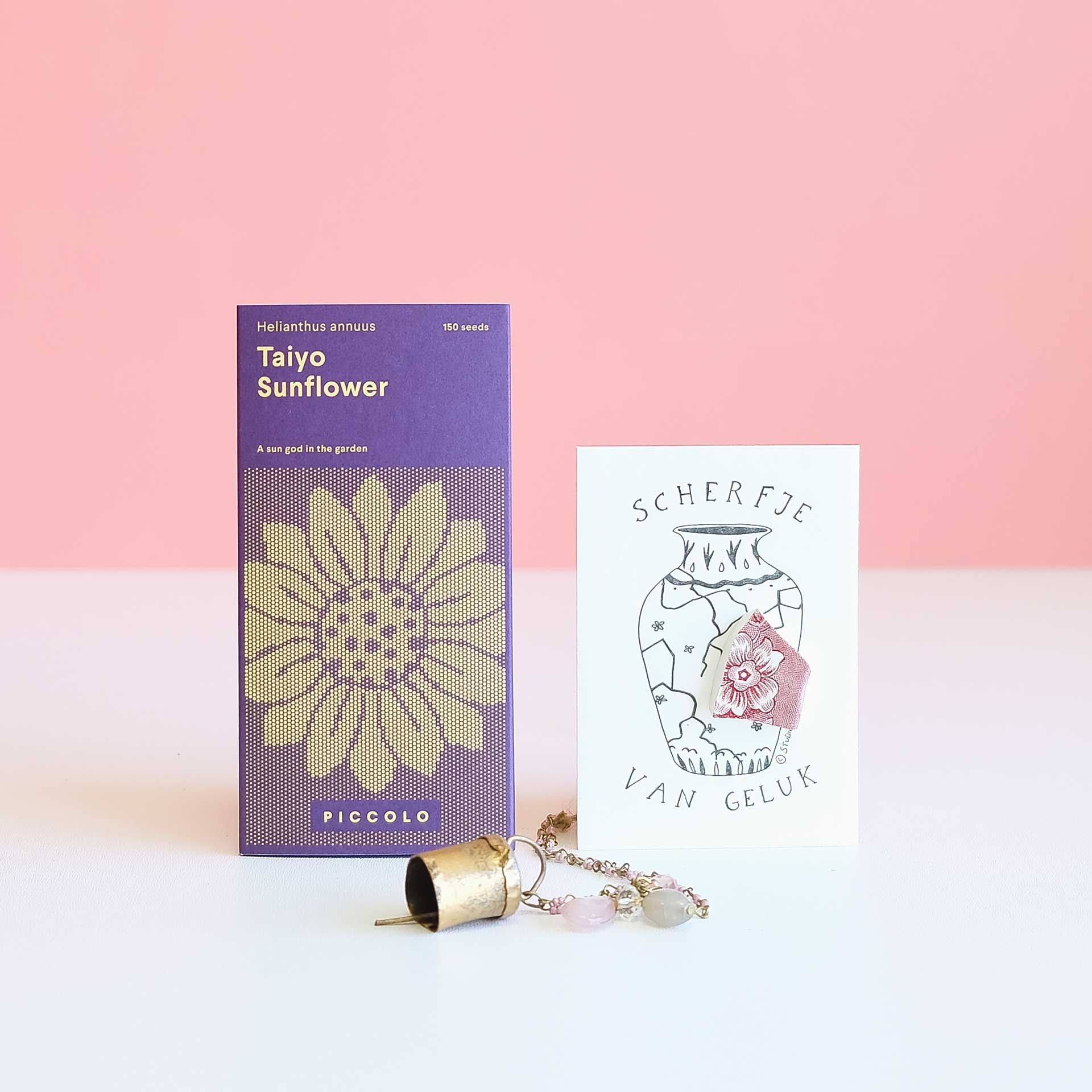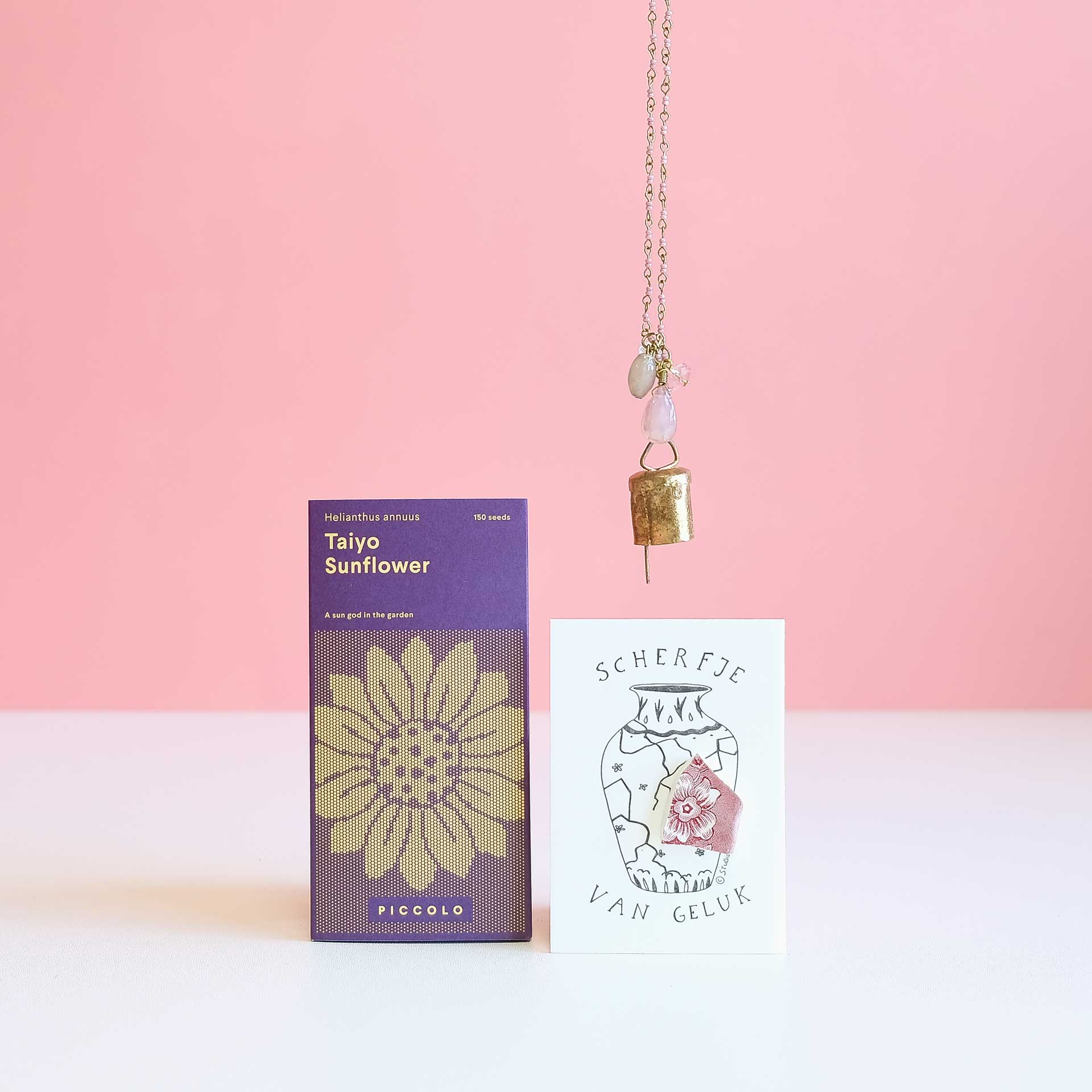 Verzend een beetje brievenbus geluk! Stuur deze cadeaubox naar diegene die wel een scherfje van geluk door de brievenbus kan gebruiken. Daarbij zaden van Zonnebloemen welke geluk, liefde en kracht brengen. En om het af te maken een decoratieve bel hanger als symbool voor vreugde, vrijheid en geluk. Wie verras jij met dit cadeaupakket?