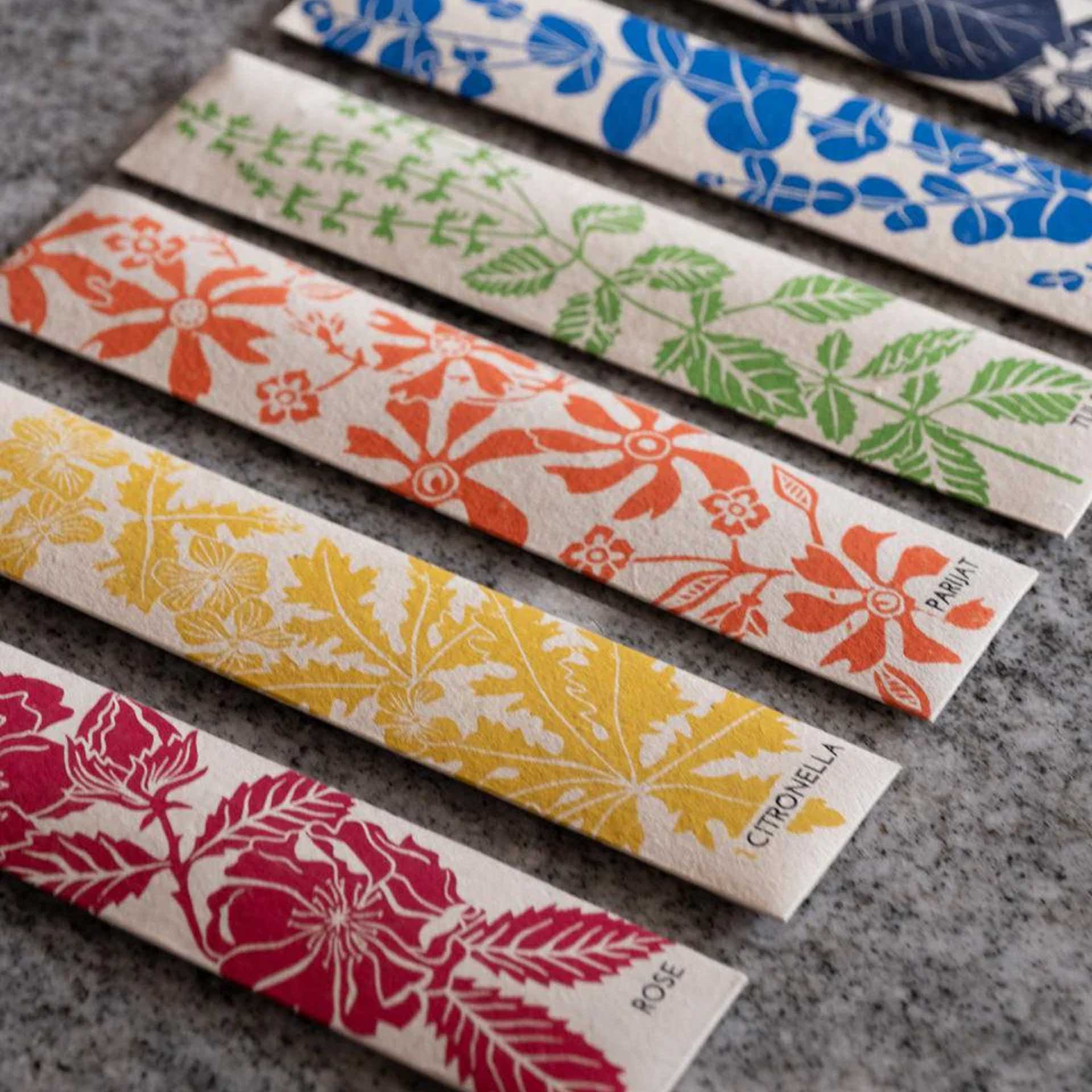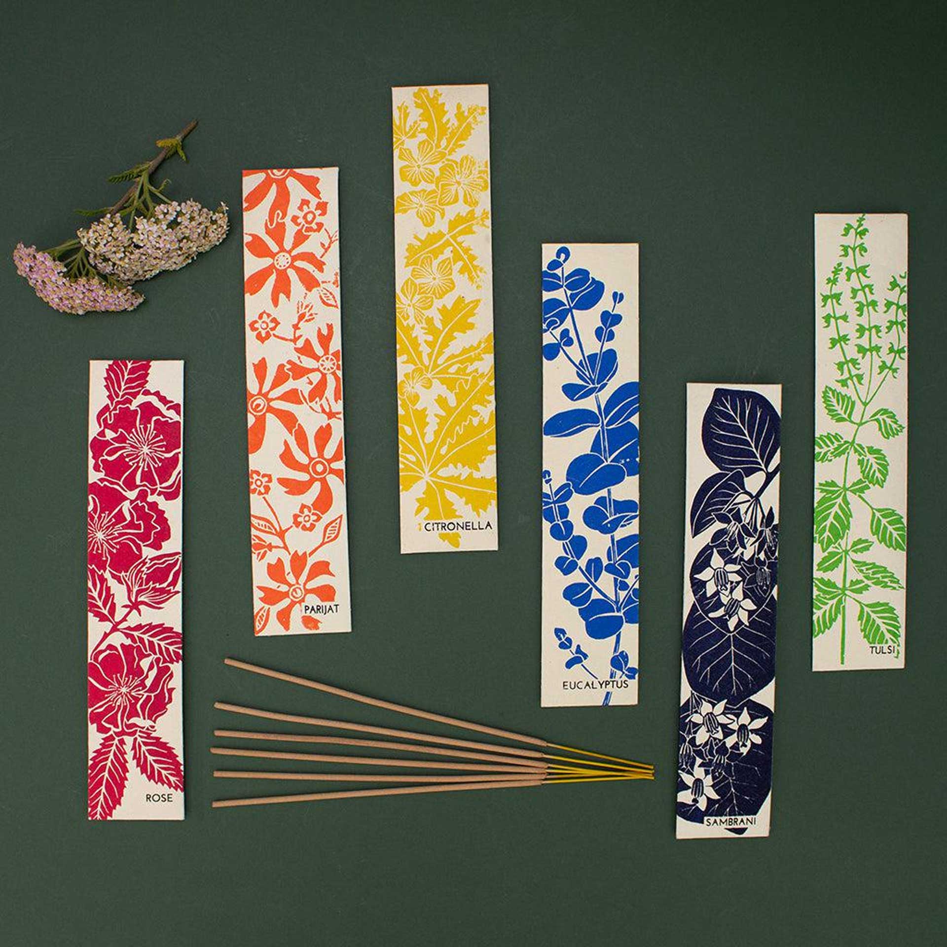 Eucalyptus wierook handgemaakt in India, verbetert creativiteit, concentratie en productiviteit met een boost van positiviteit. De wierook wordt met de hand gemaakt door een organisatie die gehandicapte ambachtslieden in India ondersteunt. Elk verpakking is gemaakt van milieuvriendelijk gerecycled papier met een zeefdruk van een prachtig botanisch ontwerp.