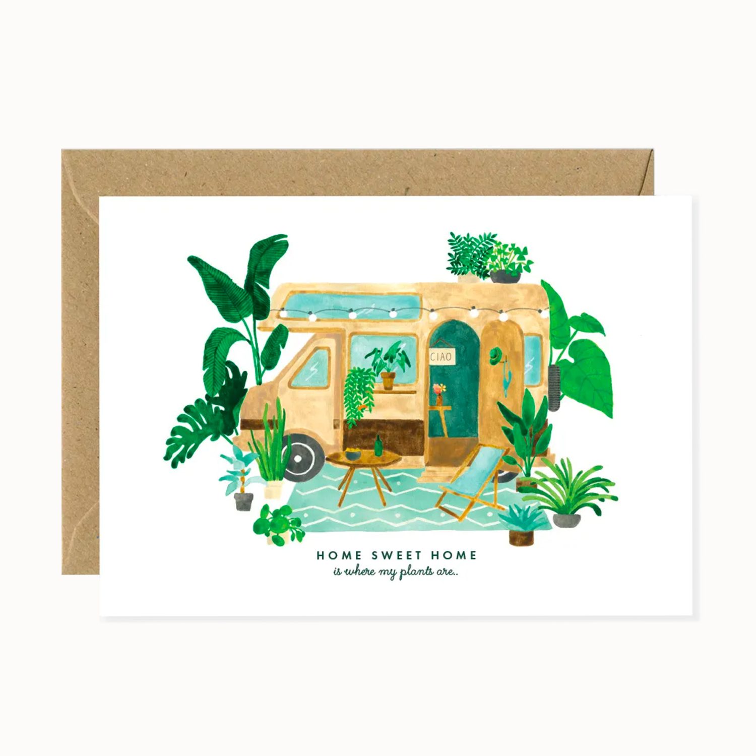 Lekker met de camper op avontuur, bomvol planten. Fijn zo’n eigen thuisje op wielen! Stuur deze Home Sweet Home kaart naar die ene avonturier die zijn spullen gaat pakken en er lekker tussenuit gaat. Een prachtig geïllustreerde kaart met goudfolie voor plantenliefhebbers en globetrotters.