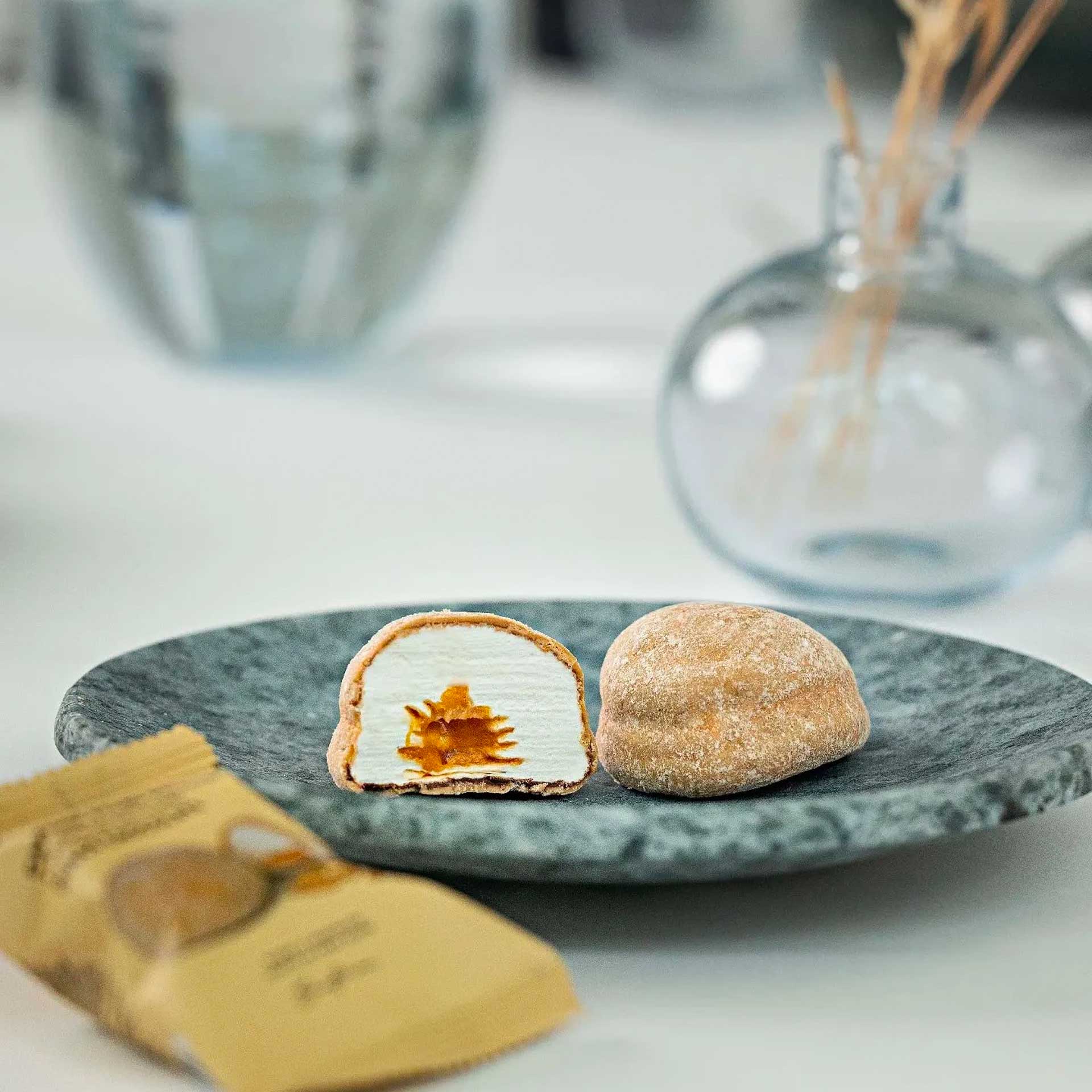 Deze met karamel gevulde marshmallow van The Mallows is omhuld met rijk, gekarameliseerde witte chocolate, ook wel bekend als Dulce Chocolate. De vloeibare karamel binnenin vermengt zich met de vanille marshmallow en de knapperige stukjes zeezout bij de eerste hap.