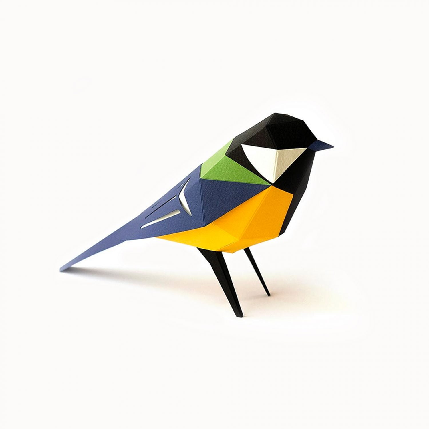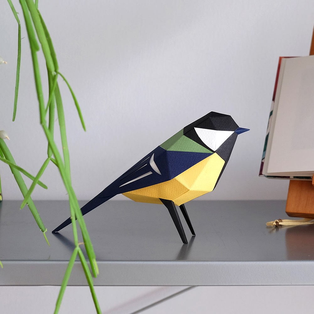 Zet met dit pakket zelf deze papieren vogel in elkaar! Je vouwt alle papieren onderdelen en lijmt ze aan elkaar tot deze prachtige Koolmees. Een kleurrijke Design Vogel met zijn karakteristieke zwarte das op zijn gele borst.