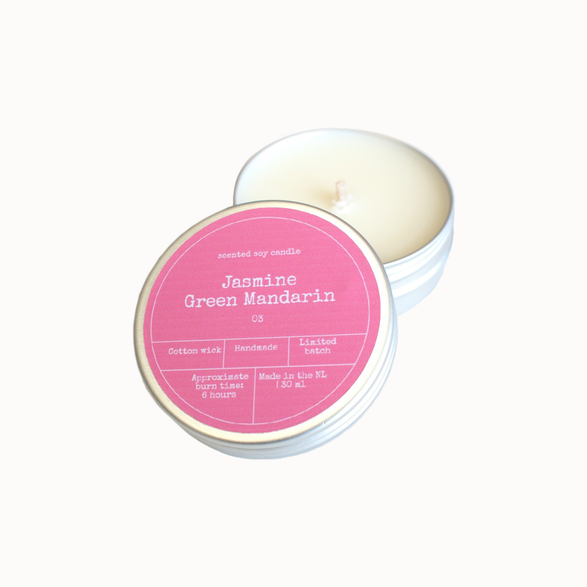 Soja geurkaars Jasmijn & Mandarijn met de verfijnde zoetheid van jasmijn en de sprankelende frisheid van mandarijntjes. Een elegante geur die je huis vult met een zonnige, bloemige energie – perfect om een vrolijke en lichte sfeer te creëren.
