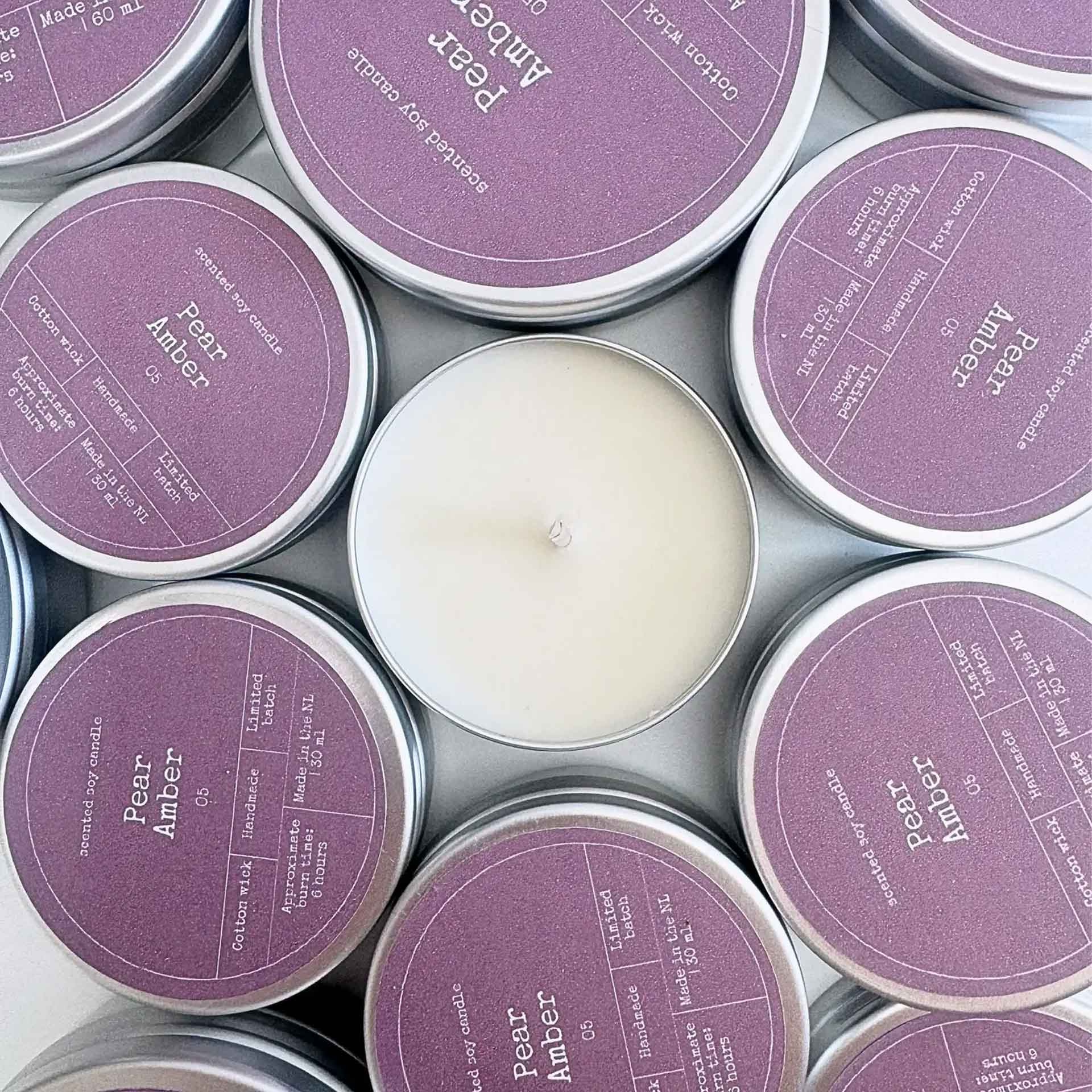 Soja geurkaars Amber & Peer in een blikje met de warme, zachte geur van amber en de frisse zoetheid van sappige peer. Gemaakt van natuurlijke sojawas, met een schoon brandende katoenen lont en verrijkt met Franse parfumolie van topkwaliteit. Deze charmante kaars zorgt direct voor een gezellige, luxe sfeer in huis – leuk om cadeau te geven, maar minstens zo fijn om zelf van te genieten!