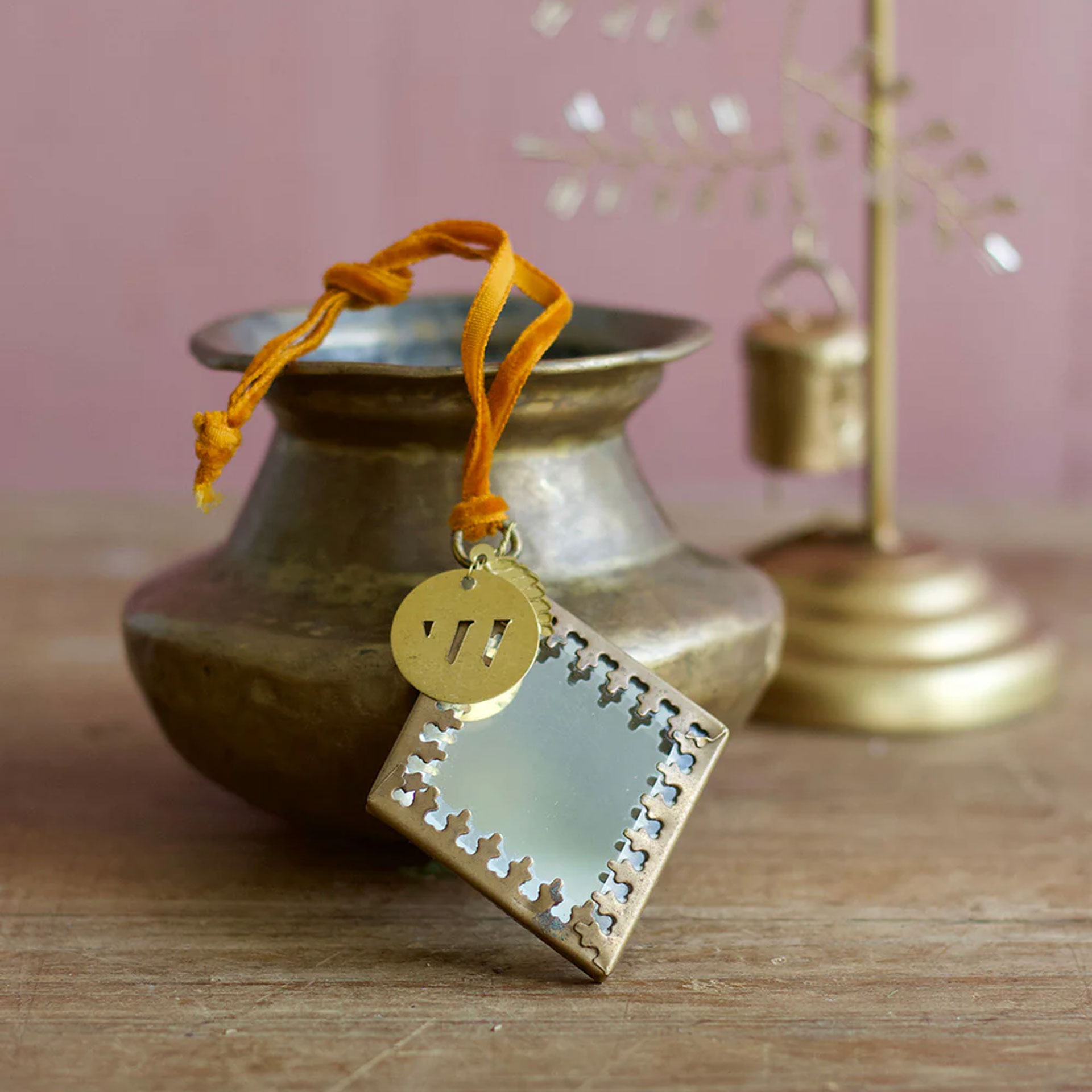 Een ruitvormige spiegel hanger vol symboliek: handgemaakt, sprankelend en tijdloos – een klein sieraad voor elk interieur.