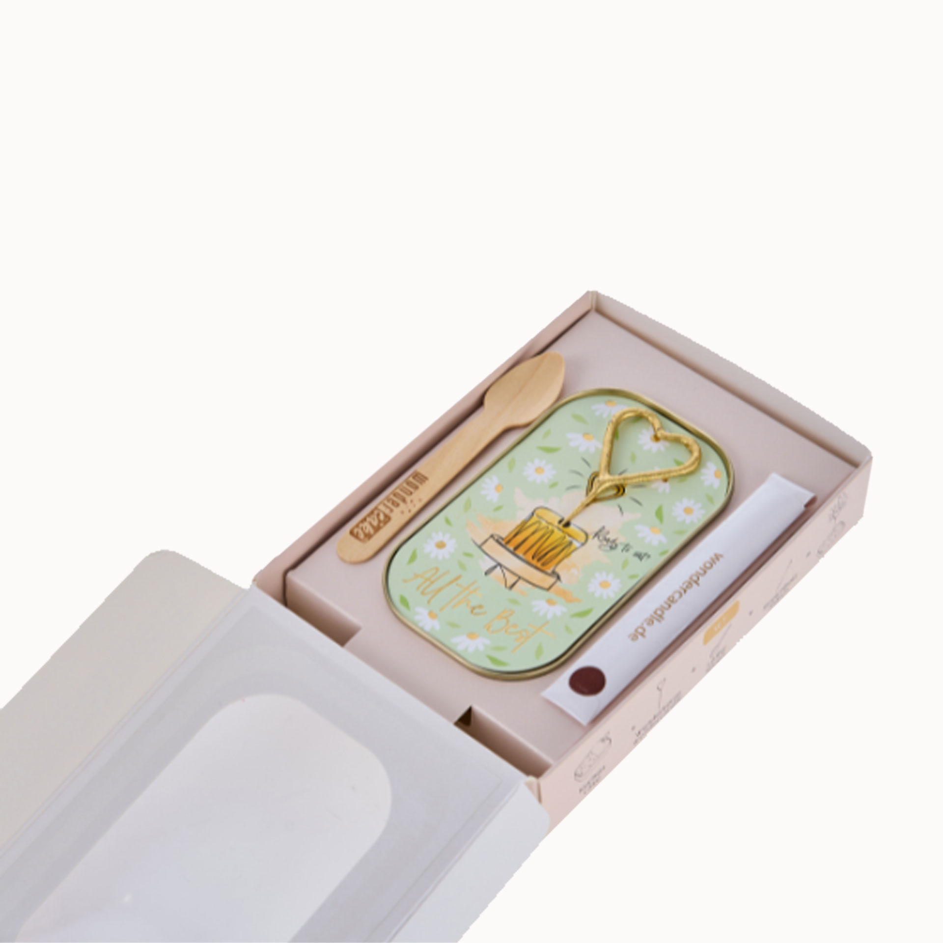 Brievenbus cake All the Best ✨ Laat iemand weten dat je aan hem of haar denkt met de Wondercake All the Best: een heerlijke cake in blik, compleet met sterretje, lucifers én een lepeltje. Alles zit erin om direct een warm en liefdevol moment te beleven. Open het blik, steek het sterretje aan en zie hoe kleine vonkjes veel warmte overbrengen. Deze bijzondere brievenbus cake is hét perfecte cadeautje om iemand te verrassen met een beetje liefde door de brievenbus – een klein gebaar met een grote betekenis.